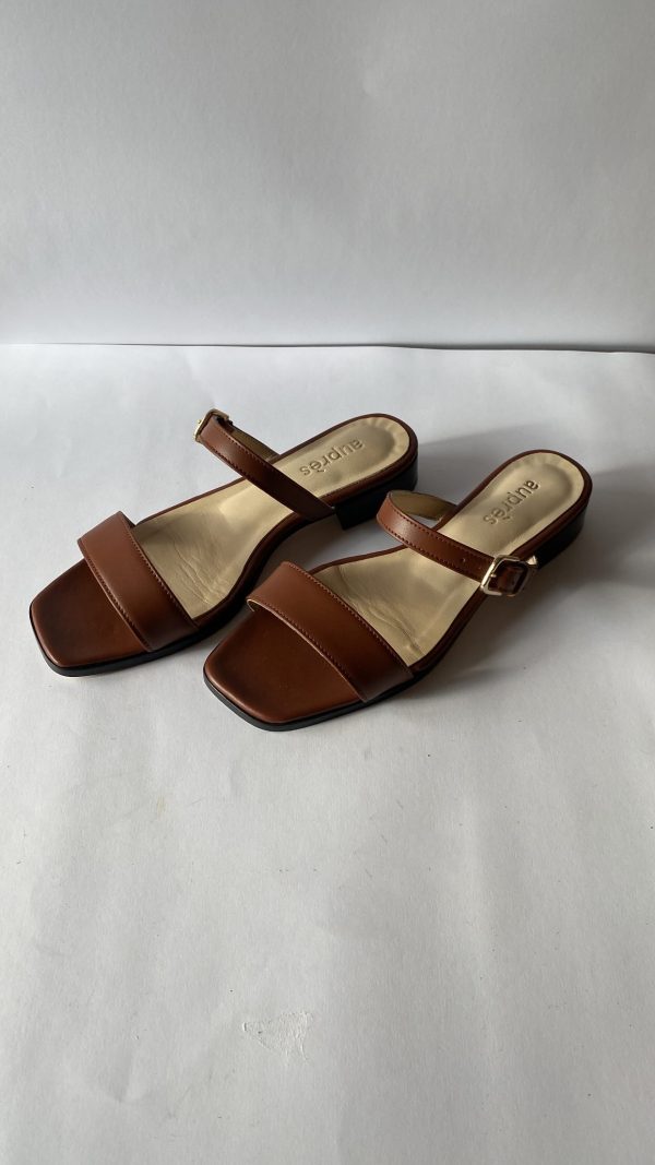 Open-toe sandal crafted from certified sustainable Italian leather, featuring a square toe, a wide strap at the front and covered custom heel. Chrome-free leather lining. Padded leather footbed and leather sole. Made in Portugal.
